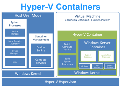 • Hyper-V Containers : Exécution sous le contrôle d’hyperviseur optimisé. Chaque conteneur se retrouve dans une machine virtuelle hautement optimisée. Cette version permet d’offrir une isolation plus importante que la solution par défaut. Une attente remontée par les grandes entreprises. Il existe trois systèmes d’exploitation permettant d’héberger des conteneurs : Windows Server 2016 version complète avec une interface graphique similaire à Windows 10 et Server Core dépourvue de l’interface graphique du poste client. et Windows 10 mise à jour Anniversaire.