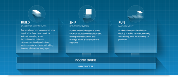 Le conteneur est une nouvelle forme de binaire capable d’exécuter nos applications n’importe où et sans contraintes. Ceci change véritablement notre rapport à l’infrastructure : pas d’affinité avec un langage, pas de souci de déploiement, pas de problème de mise à l’échelle. Le slogan docker affiche d’ailleurs vaillamment : BUILD, SHIP, RUN.