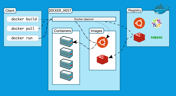 Pour résumer le fonctionnement de docker. Le client sollicite le démon (Docker Engine) via de commandes afin de gérer à la fois les conteneurs et les images respectives. Ces images lorsque qu’elles peuvent être partagées, sont mis à disposition dans le registre docker.